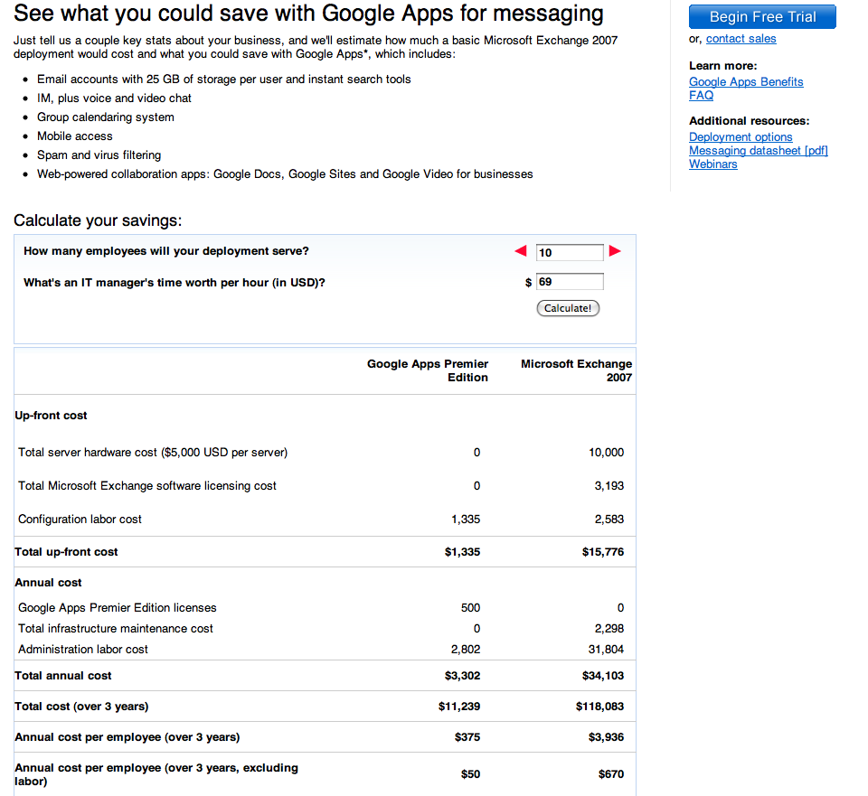 In the above example, Google Apps provides a compelling cost benefit analysis for switching from Microsoft Exchange 2007 to Google’s Premier Edition.