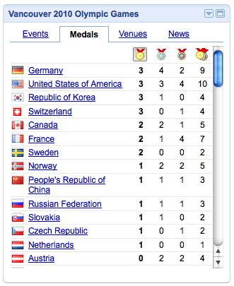 Once added to a iGoogle page, users can select and view Olympic Events, Medals won by each Country, Event Locations via the Venues link and Olympic News.