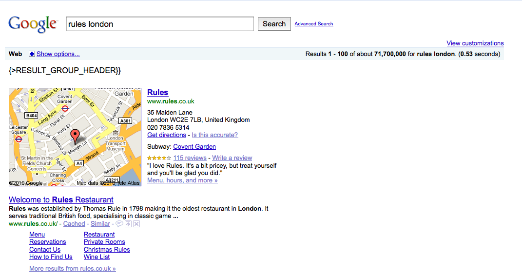 Tags: Funky Google Search Result, Local Business Listing, Rules London, Vertically Integrated Restaurant