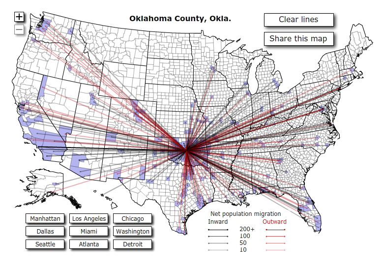 Source: Internal Revenue Service data. The IRS only reports inter-county moves for more than 10 people, so some moves are not shown on this map.