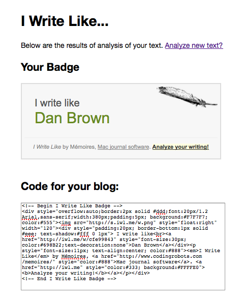 Surprised again… I Write Like said the piece was similar to something Dan Brown would write.