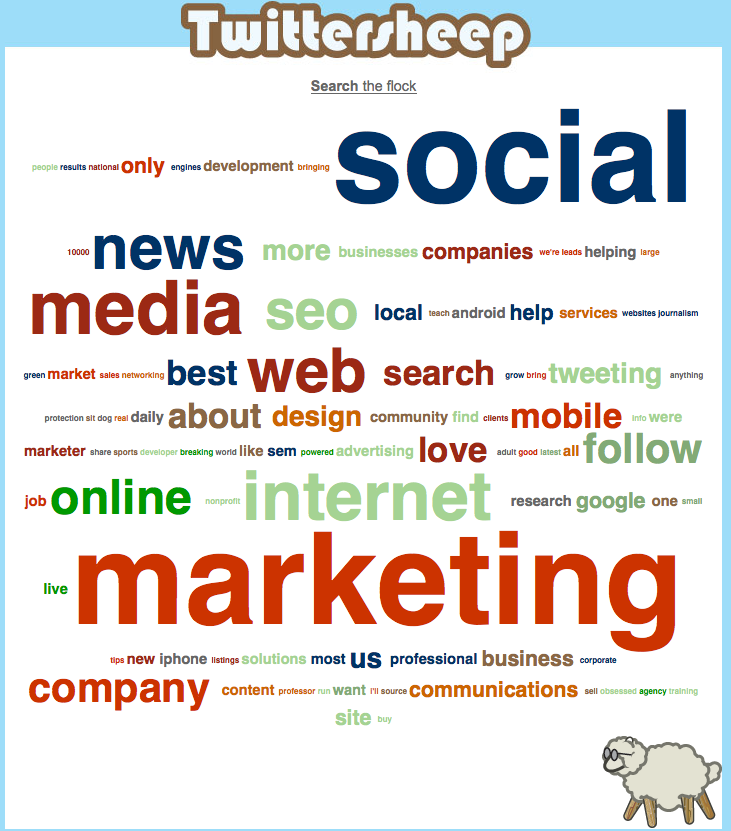 Plug your name into TwitterSheep to get the picture – a picture of their tag cloud.