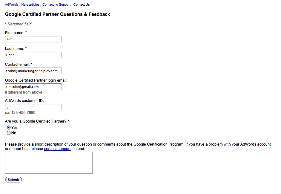 Google has added a questions and feedback form to the Google Certified Partner section of the Adwords site.