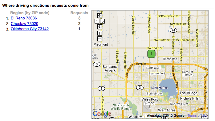 A cool feature within the Google Places Dashboard is the driving direction data it provides from searchers who requested directions to a Google Places listing’s place of business.