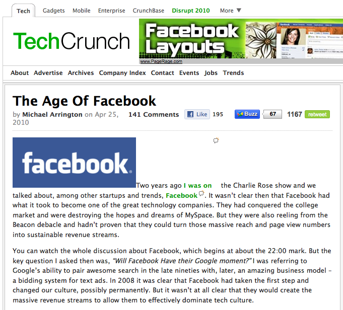 Had Techcrunch ever left you wondering as to whether or not their editorial voice was for sale, today they eliminated any doubt with the following Facebook fanboy headline: The Age of Facebook.