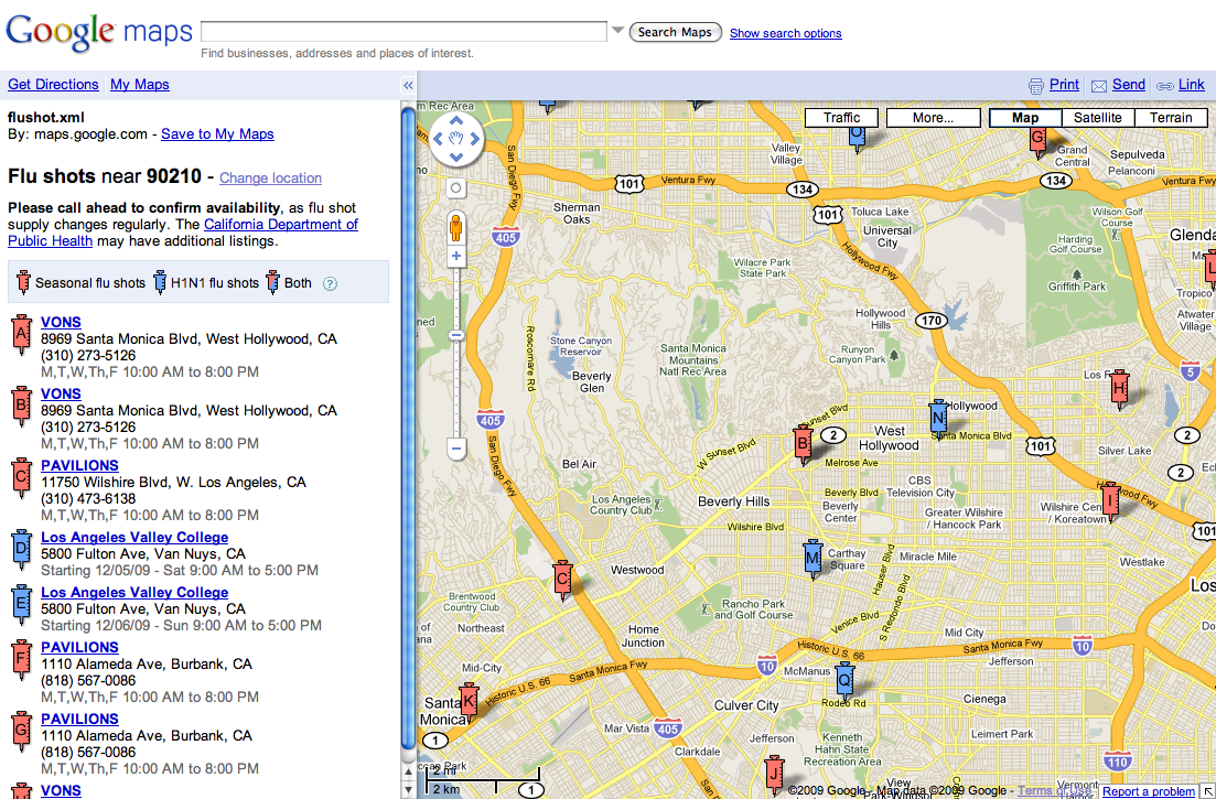 Google recently launched a flu shot locator, which uses Google Maps to show searchers nearby locations offering seasonal and/or H1N1 flu vaccine.
