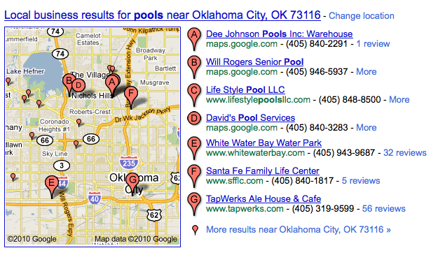 Local Business Results For Pools in Google Maps