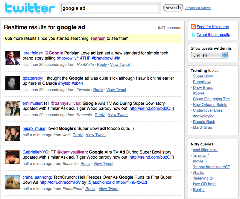 Google’s airing of their first commercial during a Super Bowl is producing hundreds of Tweets every ten to fifteen minutes yet Google’s search results recycle the same tweets over and over again if at all.