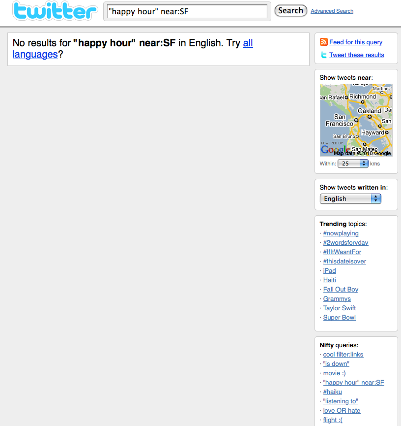 Upon clicking “happy hour” Near SF which is effectively where Twitter is located, I was surprised to see no search results.