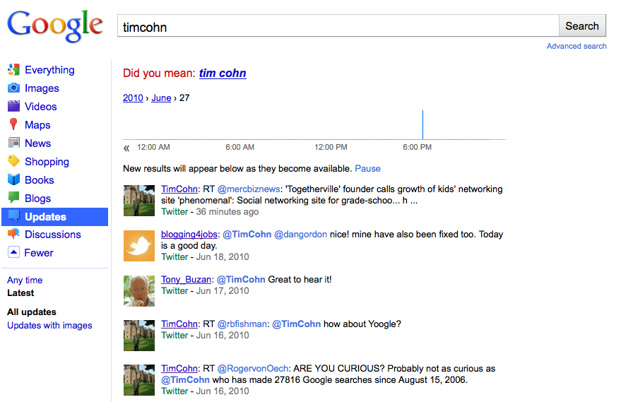 A Google search for my name in Google Updates produces a list of people who posted links with my name spelled and spaced correctly – Tim Cohn.