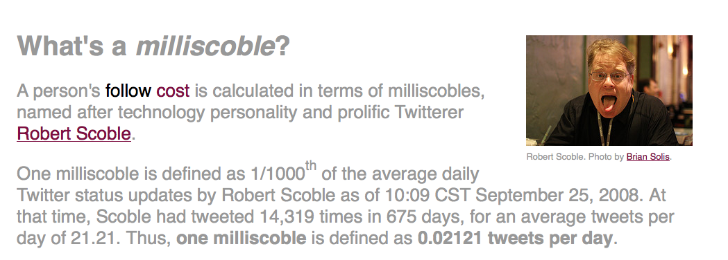 FollowCost.com measures its Twitter following costs in units called Milliscobles.
