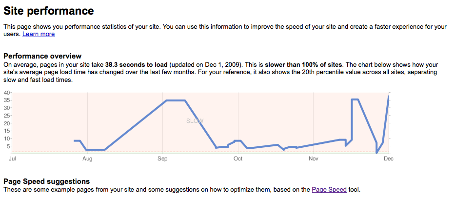 On average, pages in your site take 38.3 seconds to load (updated on Dec 3, 2009). This is slower than 100% of sites. The chart below shows how your site’s average page load time has changed over the last few months. For your reference, it also shows the 20th percentile value across all sites, separating slow and fast load times.